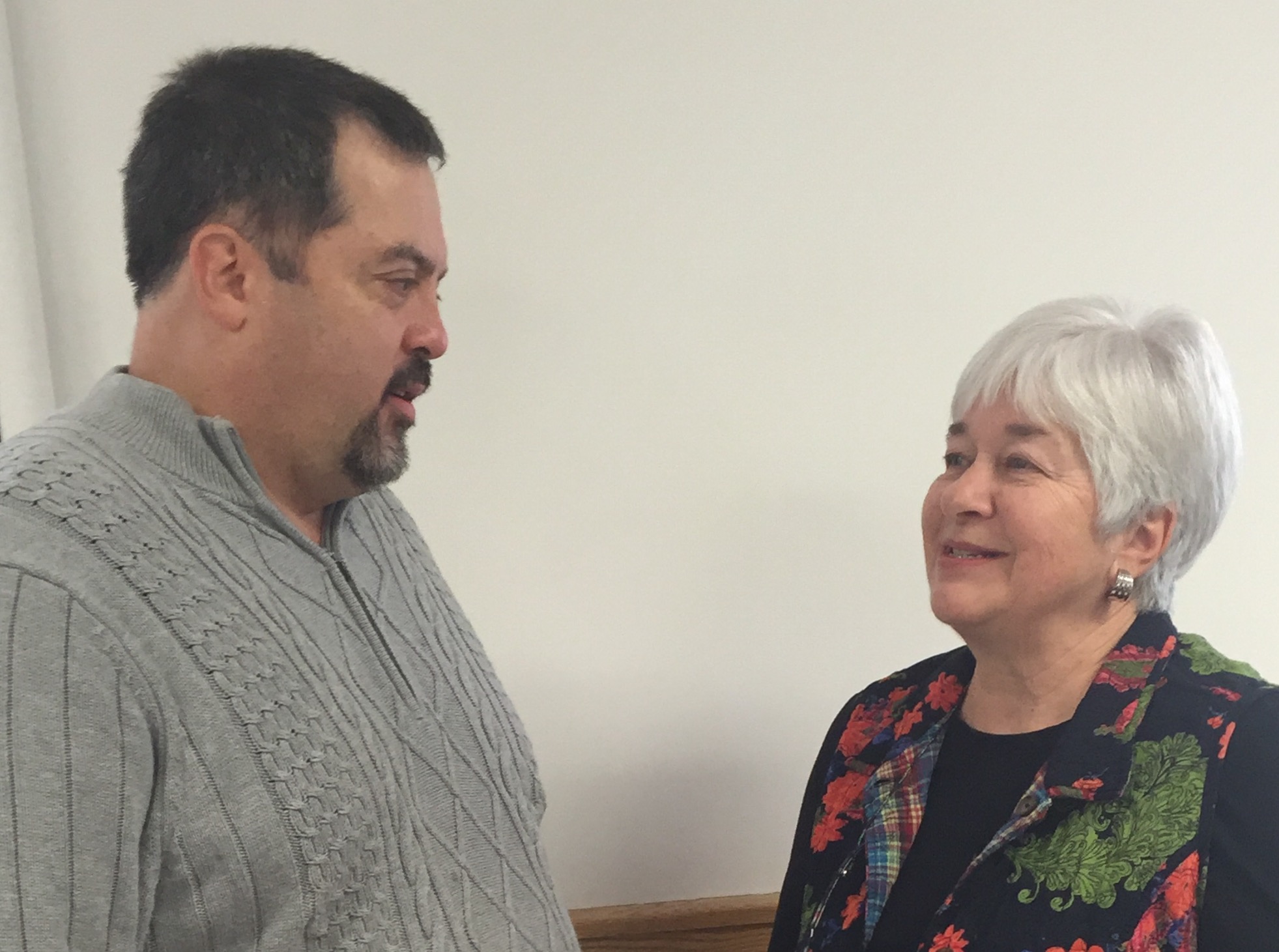 The Rev. Dennis Ashley, left, and Arlene Bean as they discuss plans for the third Community Lenten Luncheon, to take place today (Wednesday) at noon at First Baptist Church on Court Street. The free lunch, followed by a brief Lenten devotional, consists of a variety of soups and breads.