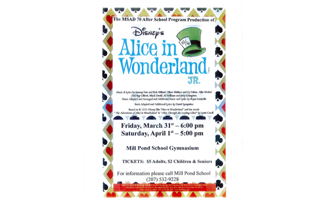 HODGDON, Maine — The SAD 70 After School Program will present Disney’s “Alice in Wonderland Jr.” this Friday, March 31, and Saturday, April 1, at the Mill Pond School gym.