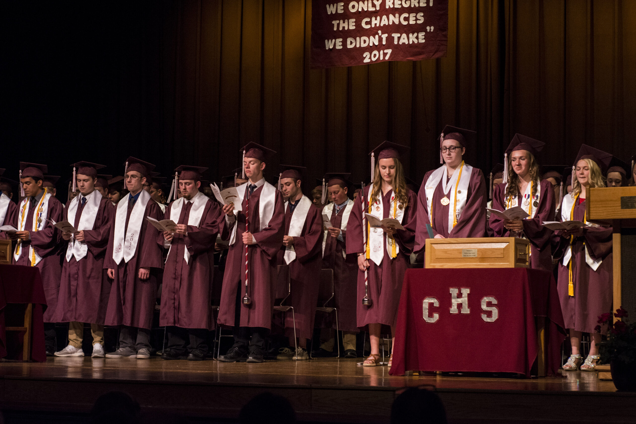 Before receiving their diplomas, members of the senior chorus accompanied by Amy Hunter and Vicki King, performed “Ordinary Miracle,” and salutatorian Kendra Furber thanked all those who helped her along the path to graduation.