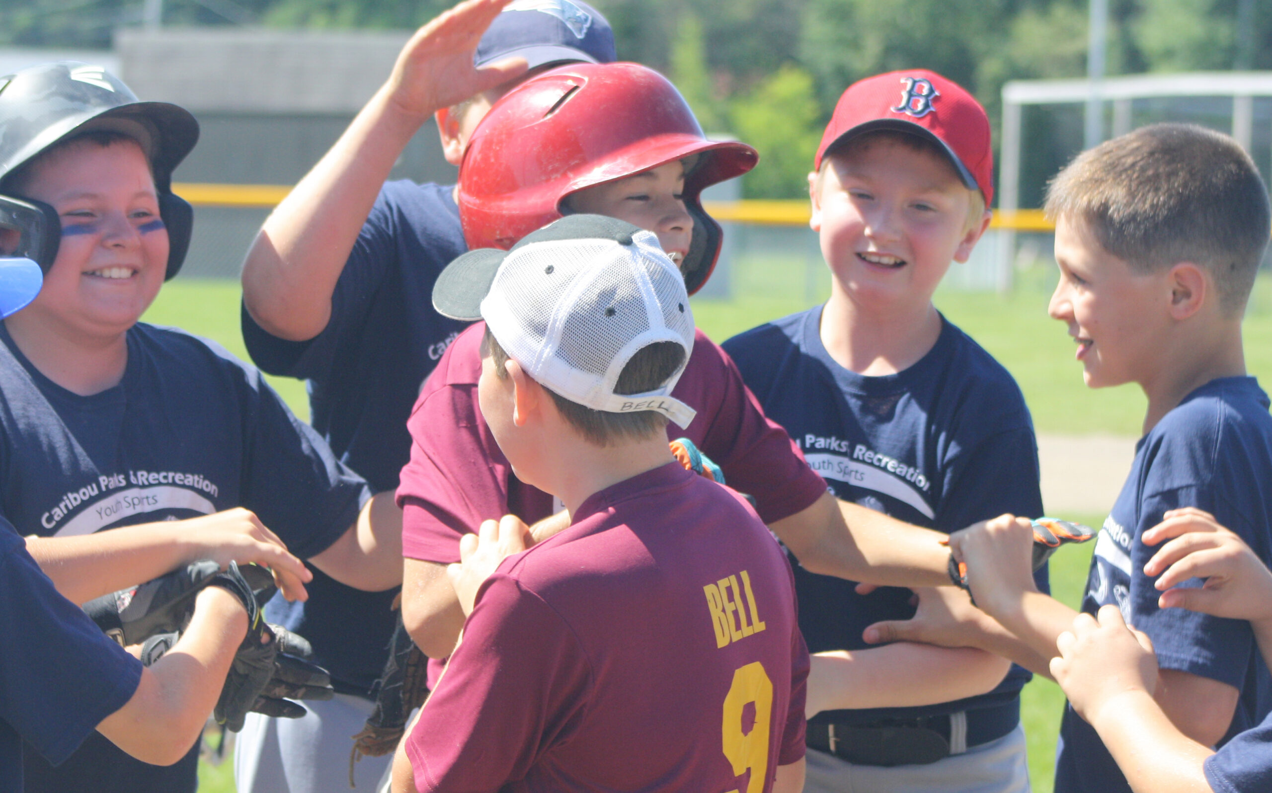 CARIBOU, Maine — Alex Levesque, center, receives a hero’s welcome from teammates as he crossed the plate following his grand slam home run in the game played Wednesday, July 26. Levesque’s Caribou team bested Madawaska, 4-1, in the NMCRA 10-12 year-old baseball tournament finals played at the Robert P. White Field in Caribou. (Kevin Sjoberg)