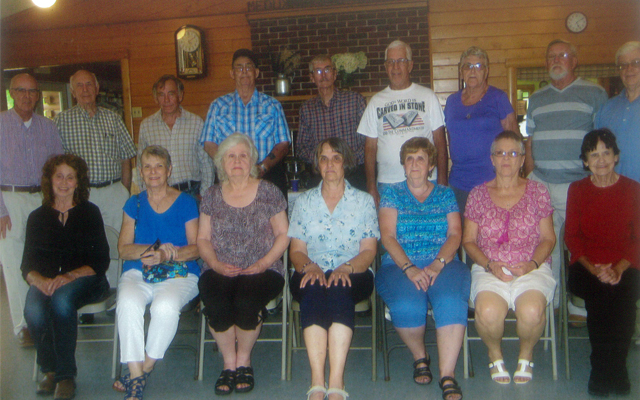 Sixteen members of the Ricker Classical Institute Class of 1957 gathered Aug. 5 at the Meduxnekeag Ramblers Clubhouse to celebrate their 60th reunion. All enjoyed an afternoon of socializing and reminiscing. After moments of silence to honor the eight deceased classmates and grace was offered by Ralph Rideout, a delicious meal was served by caterer Lorraine Cullins. Those attending were front from left, Susan Warman Henderson of Easton; Joan Callnan Small of Brooklyn, New York; Marion Nicholson Pottle of Millinocket; Anne Hanning Hutchinson of Houlton; Gail Henderson Scovill of Houlton; Joyce Briggs Murchie of Chester; and Carol Hogan Cottle of Ludlow; and back Dan McGary of Oregon, Wisconsin; Dennis Small of Oakfield; Ralph Lovely of Brownville; Dick Smith of Orono; John Elliott of Fort Kent; Ralph Rideout of Homasassa, Florida; Judith Fraser Eastham of New Limerick; Larry Hutchinson of Houlton; and W. Sedgefield White of Ludlow. Also attending were Mack Pottle, Cynthia Lovely, Harley Murchie, Molly Smith, Betty White, Lucy Elliott and Dee Rideout. (Contributed photo/Anne Hutchinson)
