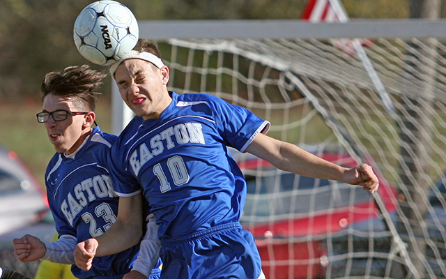 - Easton’s Alex Harvath, right, grimaces as he heads the ball (and bumps heads with teammate Gavin Pangburn) during Friday’s Class D North prelim soccer game in Hodgdon. (Staff photo/Joseph Cyr)