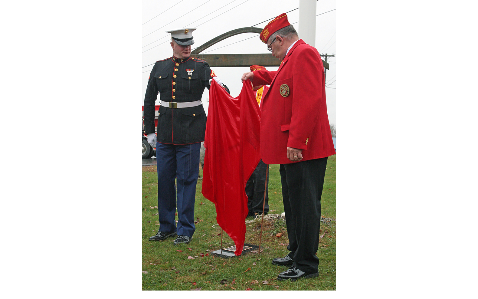 Lance Cpl. Ted Bowers, left, and Marine Corps Detachment 1368 Commandant Edward Lake unveil a plaque honoring 1st Lt. James R. Zimmerman during a special ceremony in Houlton Thursday.