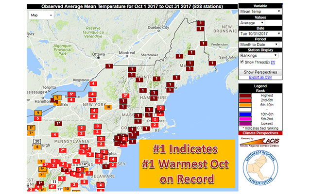 In Maine, 11 weather stations ranging from Portland to the Aroostook County town of Frenchville showed record temperatures for October. Another two dozen or so stations in New Hampshire, Vermont, Massachusetts and Connecticut also showed record warmth for the month.