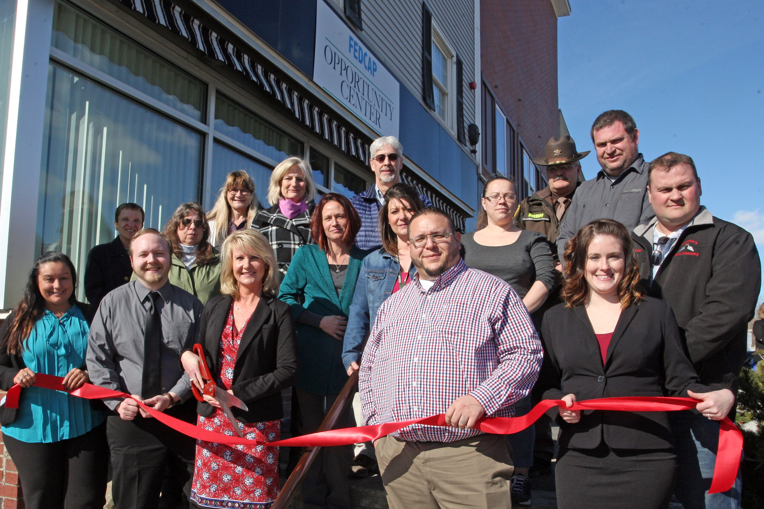 Fedcap, a program designed to create opportunities for people with barriers to economic well-being, celebrated their grand opening in Houlton with an open house and ribbon-cutting ceremony. Taking part in the ribbon cutting are, front from left, Holly Thayer, site manager; Michael Jewell, administrative assistant; Shannon Emery, regional director; Jorge Alvarado, site manager; and Cassandra McAfee, employment and community specialist; second row, Sue Tortello, town councilor; Linda Faucher, Cary Library; Sarah Cole, work readiness instructor/outreach specialist; Danielle Dorward, employment specialist/vocational evaluator; and Matt Donahue, chamber member; and back row, Shellie Murchie, Cary Library; Jane Torres, chamber executive director; Warren Tweedie, chamber member; Lt. Larry Goff; and Josh McLaughlin, chamber member.