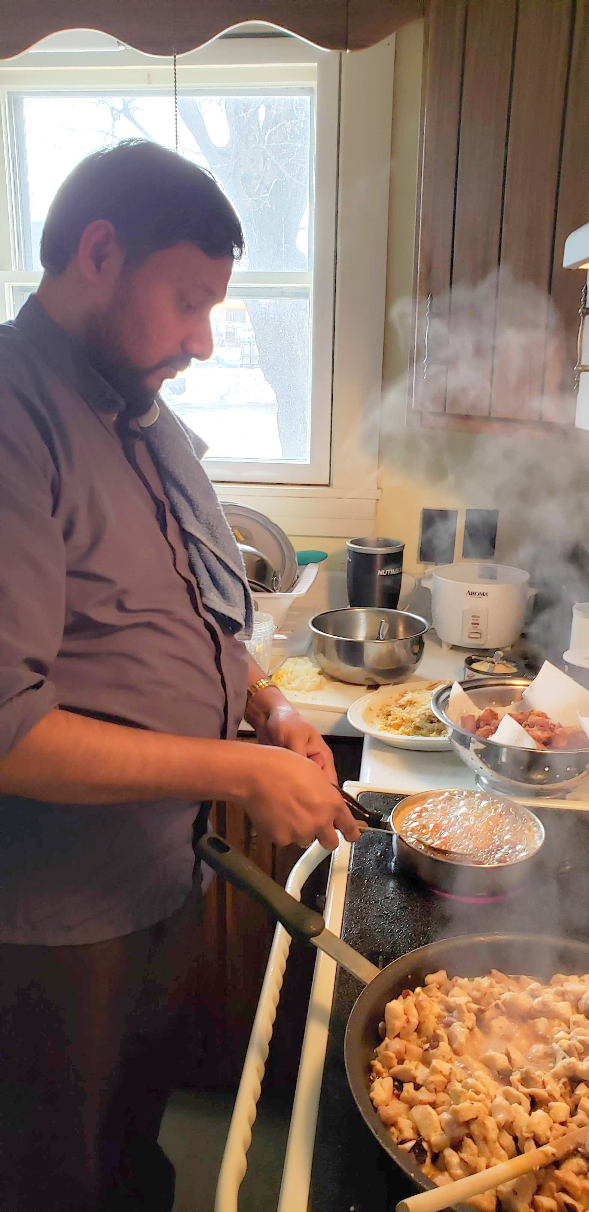 Fr. Nehru Stephen Savayaria, HGN, prepares traditional Indian dishes to serve Sunday, March 24. Lawrence Willette of Limestone won the six-course meal in a raffle to benefit the Parish of the Precious Blood’s faith formation programs.