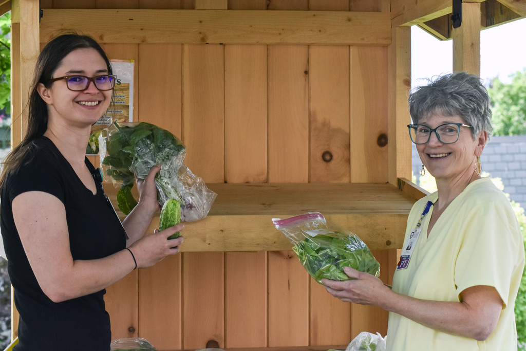 On Friday morning, Lisa Duff and Kathryn Berry, members of the Houlton Community Garden, placed some of the first produce on the stand, including their first cucumber of the season and some early lettuce. The women are both physical therapists at Houlton Regional Therapy Center and their department has taken over several garden plots at the Community Garden located on the hospital grounds.