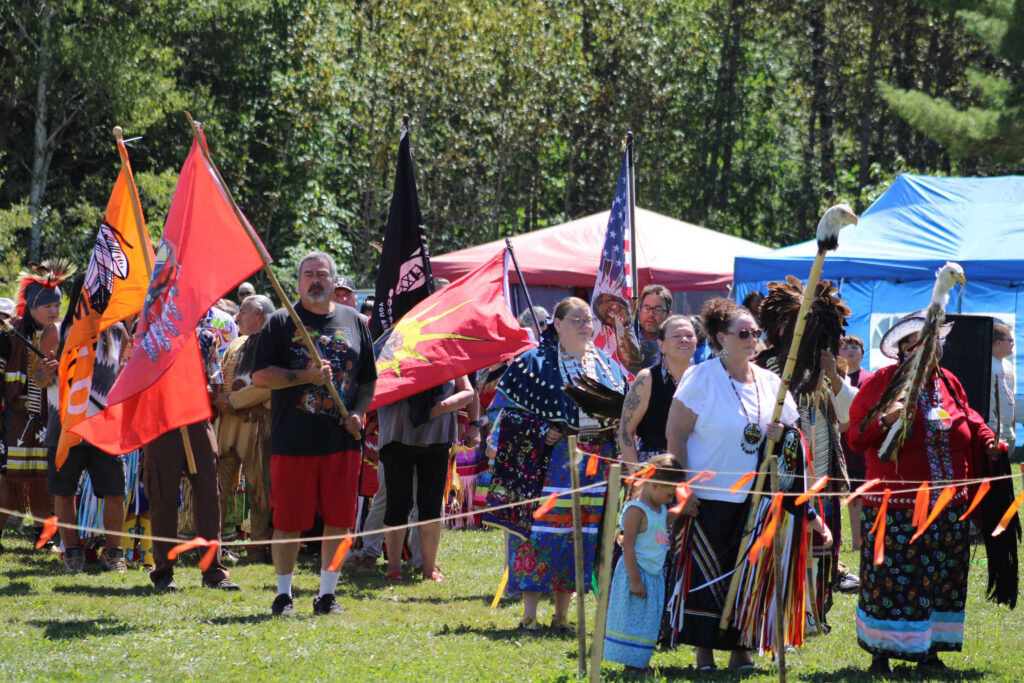 At noon, Augustine called participants forth for the grand entrance ceremony. People carrying two eagle staffs led the procession into the dancing circle. Flag carriers bore the American, Canadian, POW/MIA, “Every Child Matters” and nation flags. Groups of dancers followed.