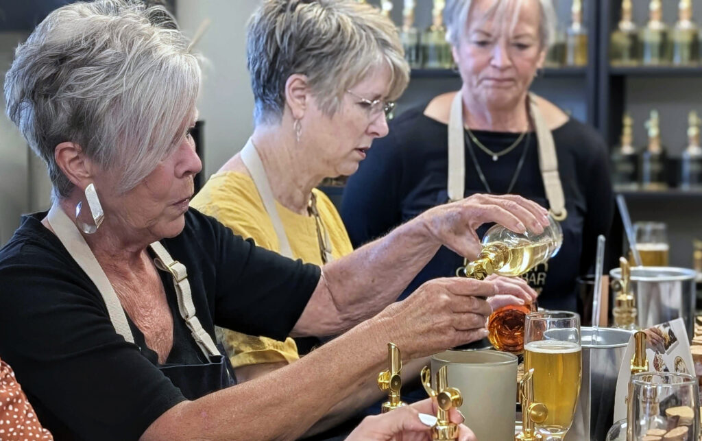 Carla Thibodeau (left) and Sue Bernard (center) mix fragance oils at Timber Candle Bar in Caribou as staff scent specialist Sue Audet assists. (Paula Brewer | The County)