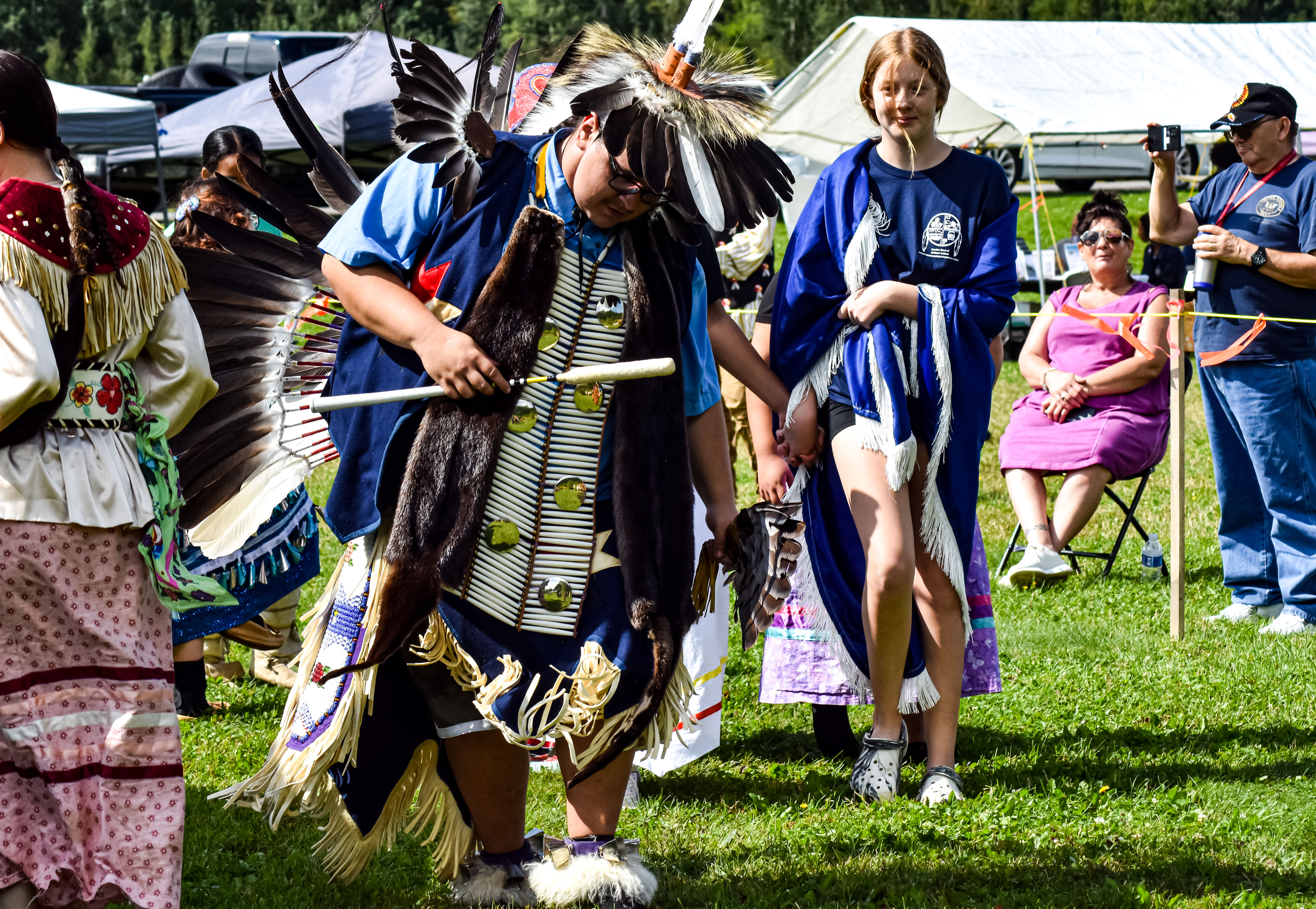 As is tradition, the ceremonial regalia of eagle feathers, furs, beads and multicolored fabrics accent the grand entry led by the tribal chief at noon on Saturday and Sunday.