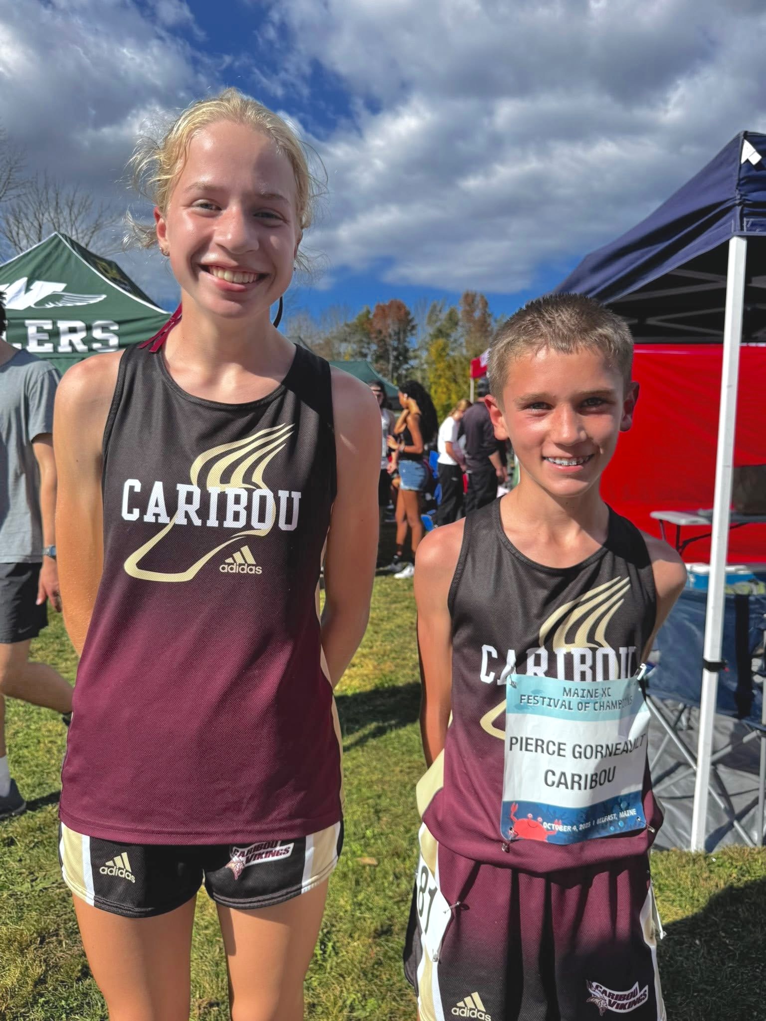 Two Caribou High School freshmen cross country runners notched first-place finishes at the Maine Festival of Champions at Troy Howard Middle School in Belfast on Saturday, Oct. 4. Nearly 80 high schools from Maine, New England and New Brunswick sent teams. Emma Graves, daughter of Evan and Erin Graves of Caribou, ran a time of 20:00.73 to best nearly 150 freshman girls. Pierce Gorneault, son of Coach PJ and Renee Gorneault of Caribou, bested 195 other runners with a time of 16:56.32. (Courtesy photo)