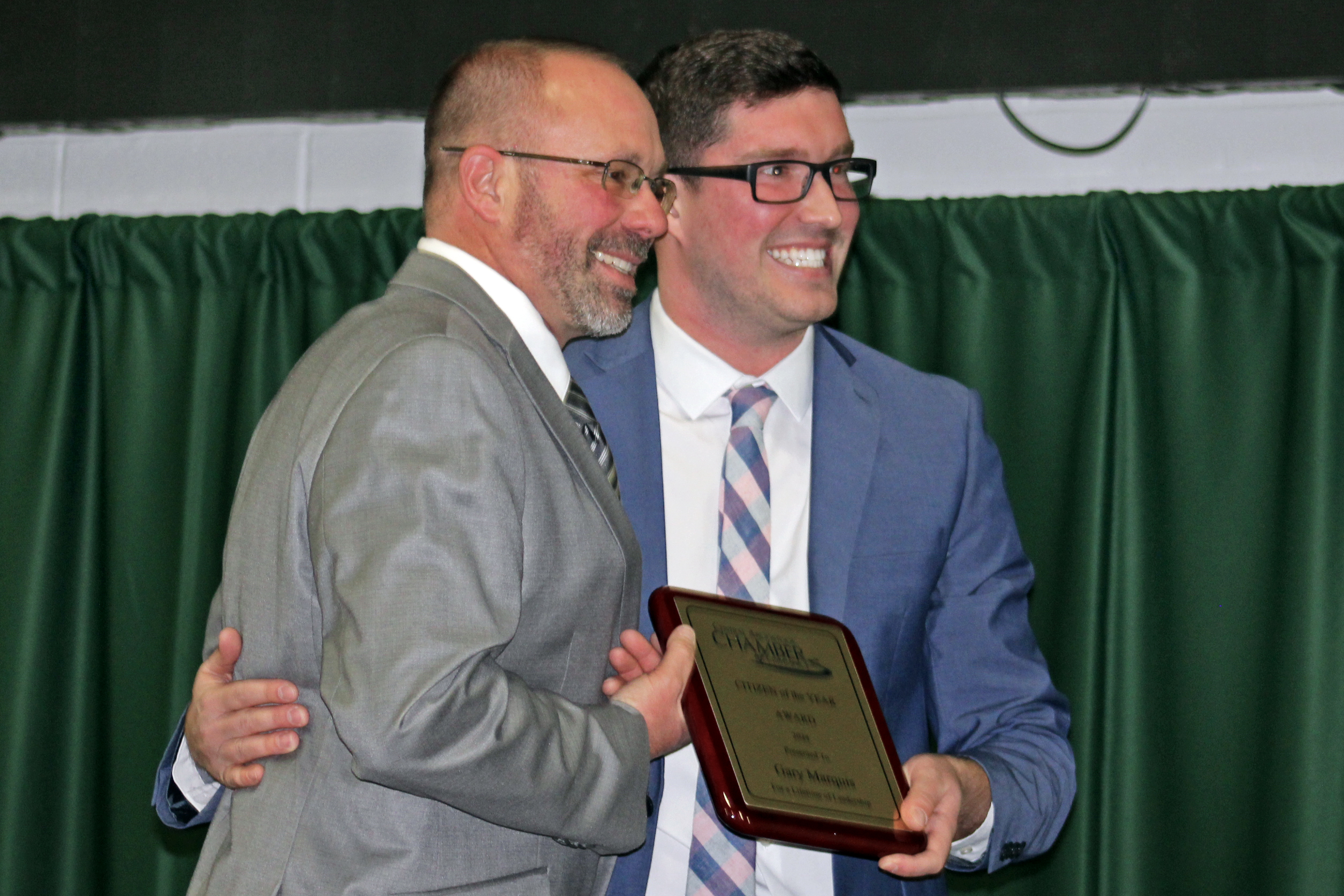 Gary Marquis (left) accepts the Central Aroostook Chamber of Commerce Citizen of the Year Award from his nephew, Michael Marquis. (Paula Brewer | The County)