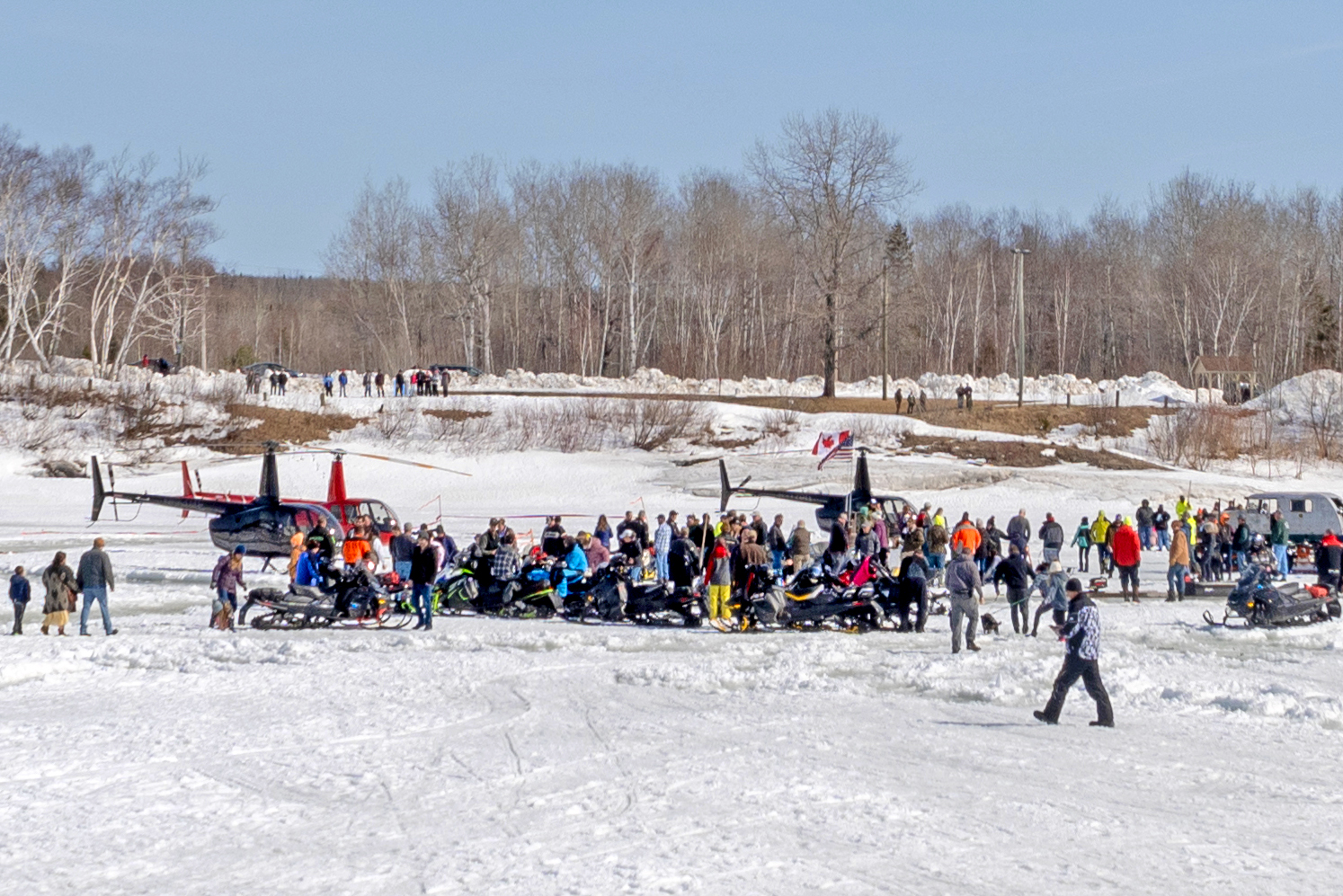 A crowd gathers among snowmobiles, helicopters and other equipment atop the first international ice carousel between Van Buren and St. Leonard, New Brunswick, on March 15, 2025. (Chris Bouchard | The County)