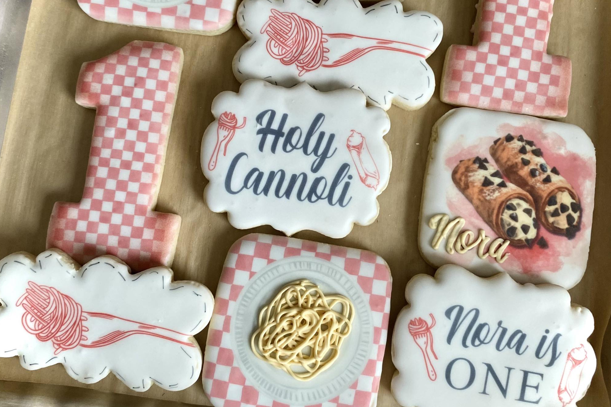 The custom decorated sugar cookies that Cyr designs for customers range from company logo cookies to party themes like the holy cannoli and spaghetti-themed cookies she created for a 1-year-old’s birthday party. Those cookies had pink plaid backgrounds and some were topped with very real-looking spaghetti or cannoli treats.
