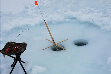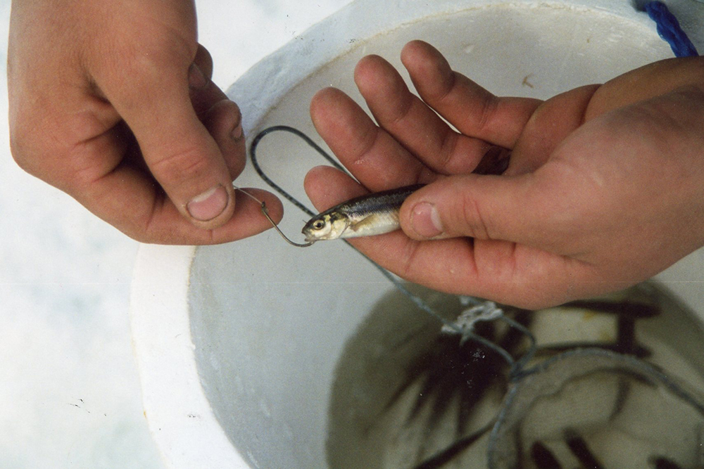 Many ice drillers, myself included, drill a second hole near a tip-up hole and jig for smelt while waiting for a flag. Occasionally a big fish will bite the jig line and it’s also a great way to catch fresh smelt to use as bait. (Courtesy of Bill Graves)