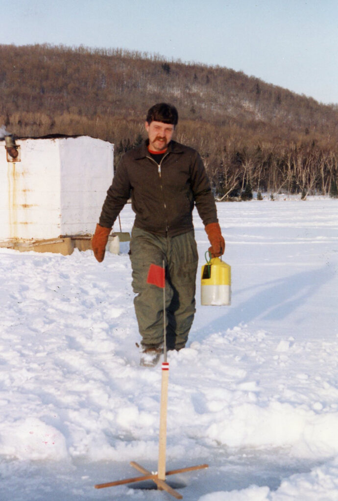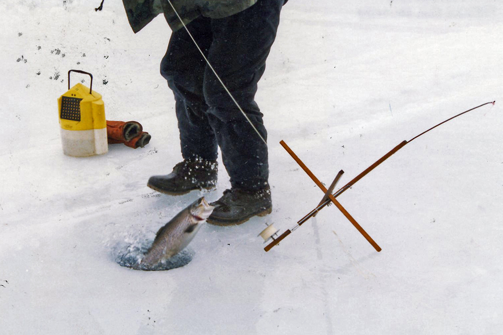 When the flag went up, this ice fisherman grabbed a small bait bucket to carry along in case the bait was gone. It’s even better when a fat trout has eaten the minnow.