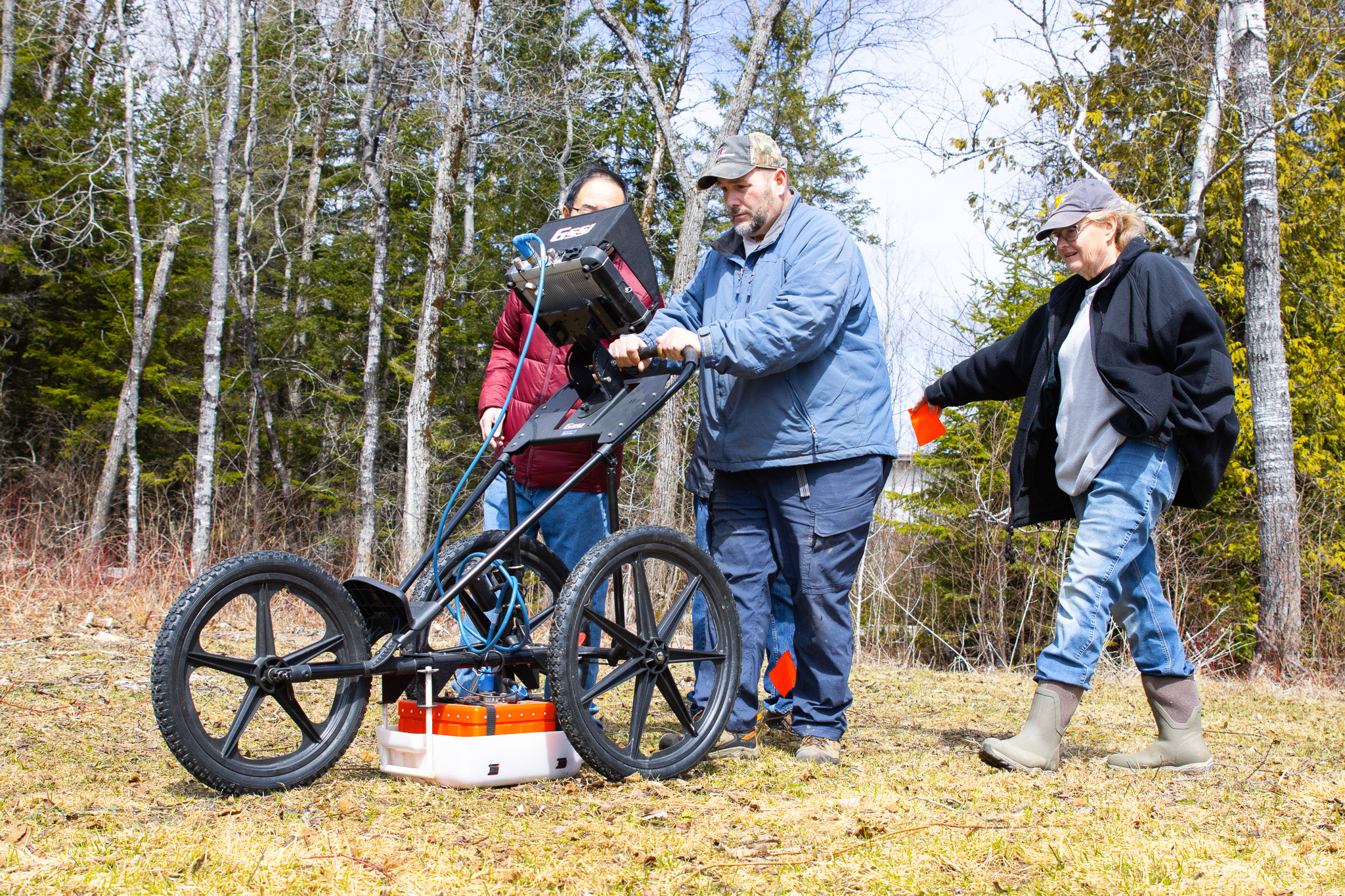 With more than a dozen volunteers gathered around him, geologist Chenzung Wang wheeled a cart across a small patch of grass on the outskirts of the former Loring Air Force Base.