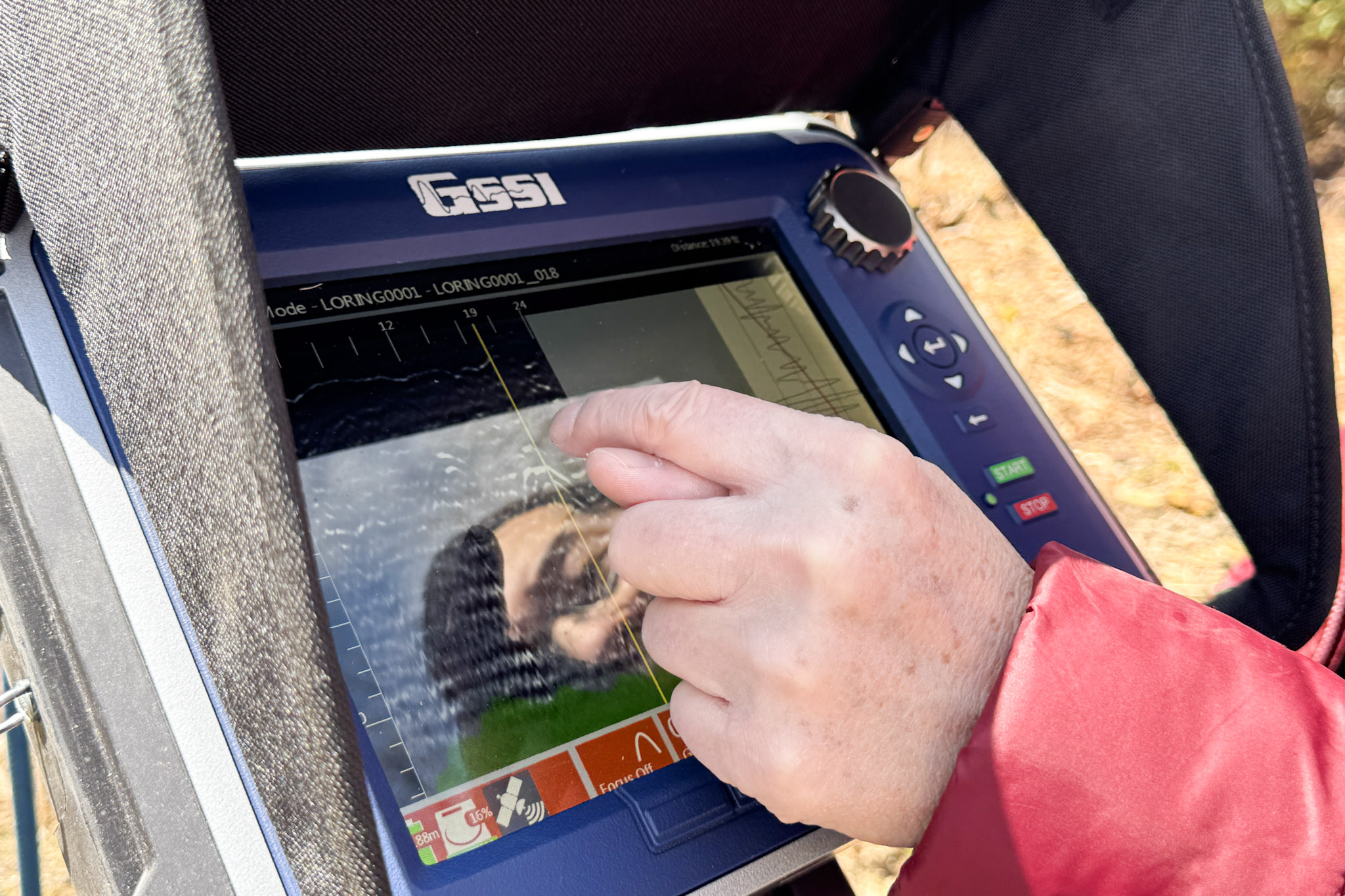 “Take a look,” he said, pointing to a blip on the cart’s computer screen. A white parabola appeared in sharp contrast to the soil around it. Picked up by ground-penetrating radar, the anomaly, as Wang referred to it, indicates that, 5 or 6 feet underground, are the remains of a sentry dog that once patrolled the base.