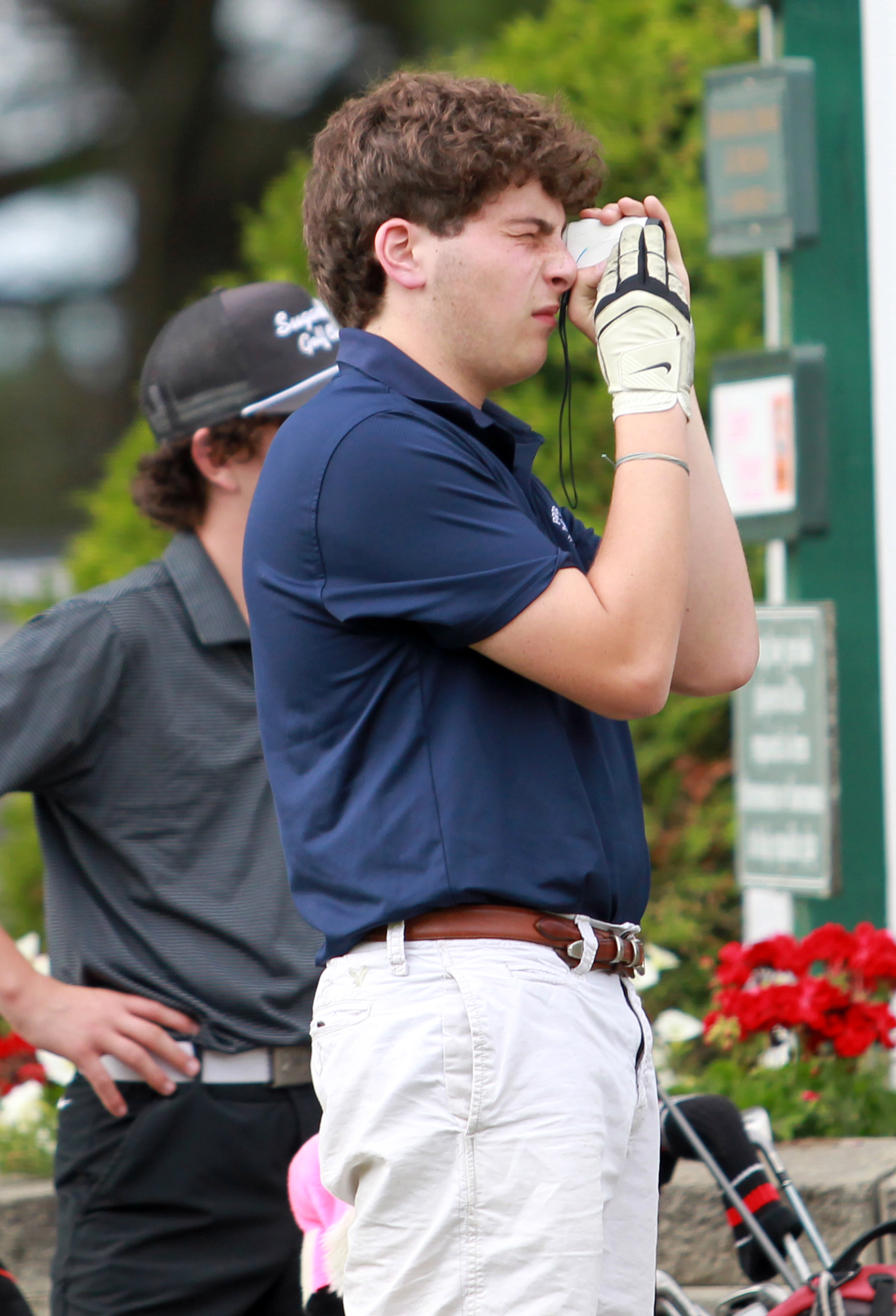 HOULTON, Maine — September 8, 2022 — Checking out the distance to the tee is Presque Isle’s Grant Stubbs during a golf match at Houlton Thursday afternoon. (Joseph Cyr | Houlton Pioneer Times)