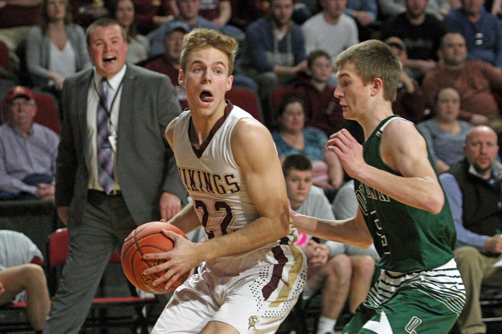 Caribou's Parker Deprey, left, is guarded by Old Town's Sam Magoon during their Feb. 19 Class B North semifinal at the Cross Insurance Center in Bangor. In the background is Old Town coach Garrett Libby. Deprey will be among the participants in next week's Aroostook League Senior All-Star Basketball Games. (Joseph Cyr | Houlton Pioneer Times)