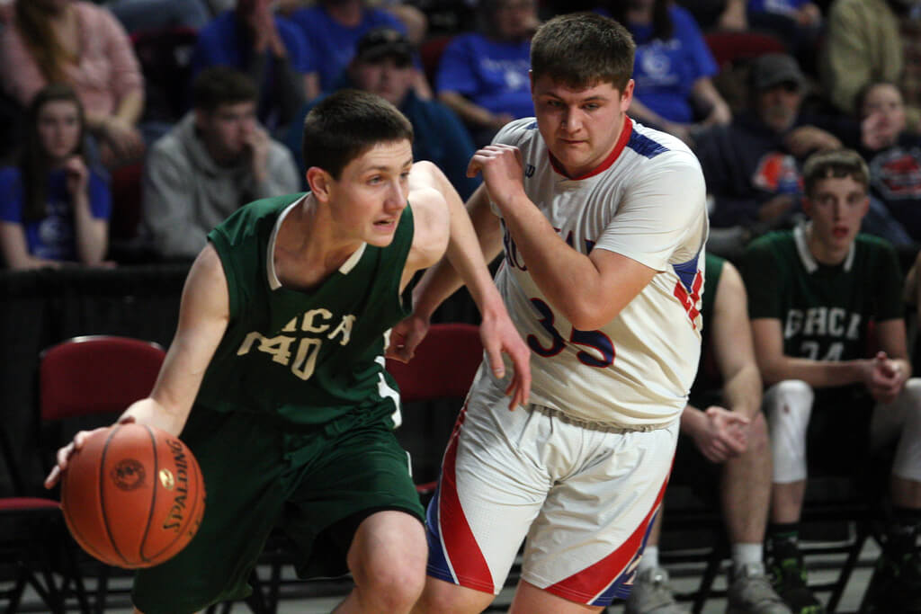 Bringing the ball up the floor during the 2019-20 MPA basketball tournament in Bangor is Greater Houlton Christian Academy's Silas Graham (left). GHCA has formed a cooperative agreement with Houlton Middle-High School for all sports and extracurricular activities. Credit: Joseph Cyr / Houlton Pioneer Times